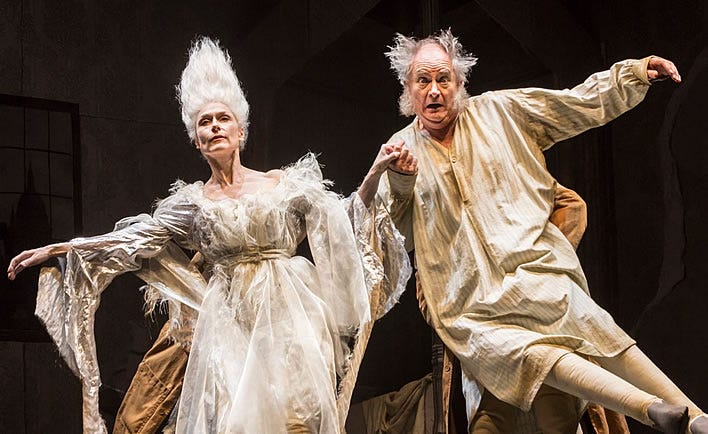 The Ghost of Christmas Past (Amelia Bullmore) and Scrooge (Jim Broadbent) in a 2015 production of A Christmas Carol. Image: ©Johan Persson.