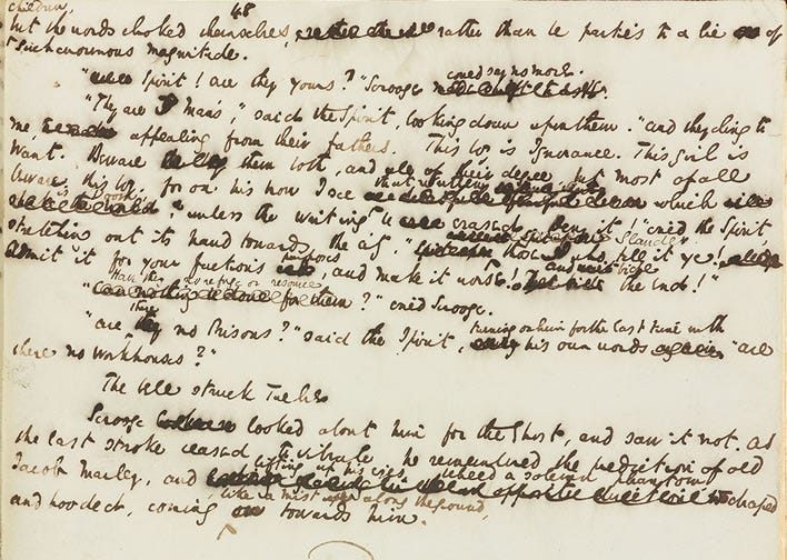 Great writer at work: image of a page of Dickens’ autograph manuscript for A Christmas Carol, December 1843. Note, for example, after a first, then a second thought (‘using’?), Dickens arrives as the final, much more powerful formulation for the damning utterance of the Ghost: ‘turning on him for the last time with his own words’. Image: The Morgan Library and Museum, MA 97, Page 48.