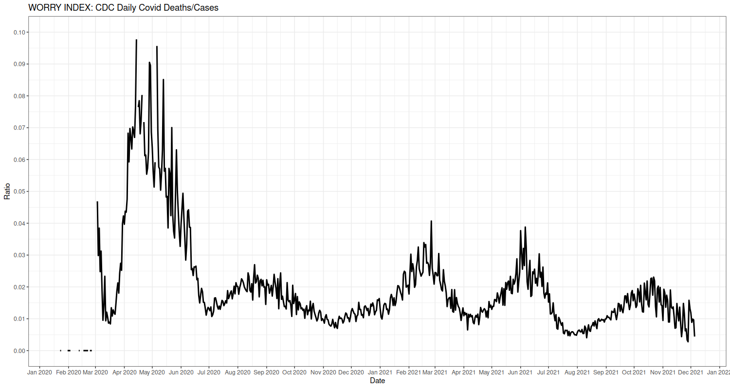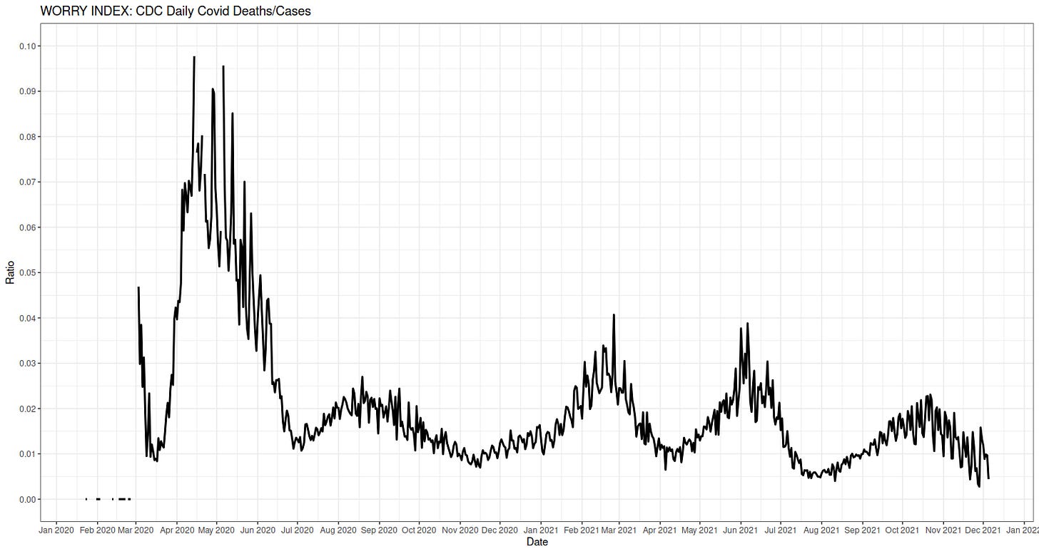 This is covid attributed deaths divided by "cases". Recall both numbers are only proxies of Reality, and are exaggerations to various extent. Nevertheless, given this, everything we've seen, and the depressing (for propagandists) new that the Ominous Omicron isn't killing anybody, I predict we'll see a peak in January, followed by a series of diminishing smaller peaks.
