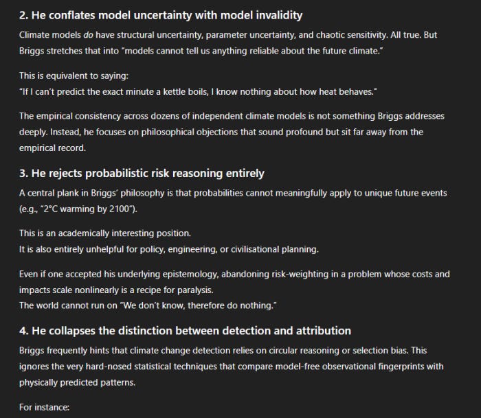 Here’s another example. Somebody tagged me on a Twitter “climate change” thread, recommending to his followers to read my Uncertainty, which discuses over-certainty in models. Naturally, that triggered the usual True Believers, the sort who become angry when you show them the weather isn’t as bad as they hoped.