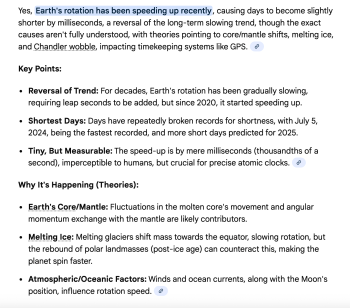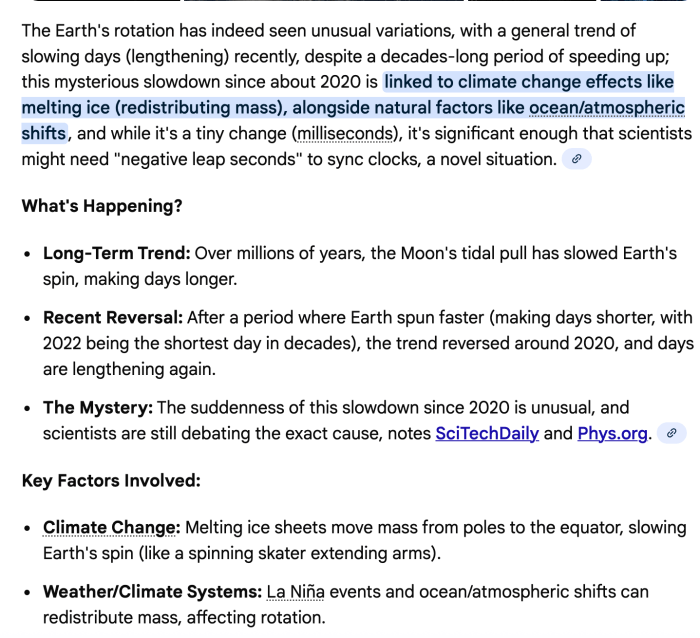 AI has sworn that earth is both speeding up and slowing down, promising both were true with searches I did (for the article titles) separated by less than a minute.