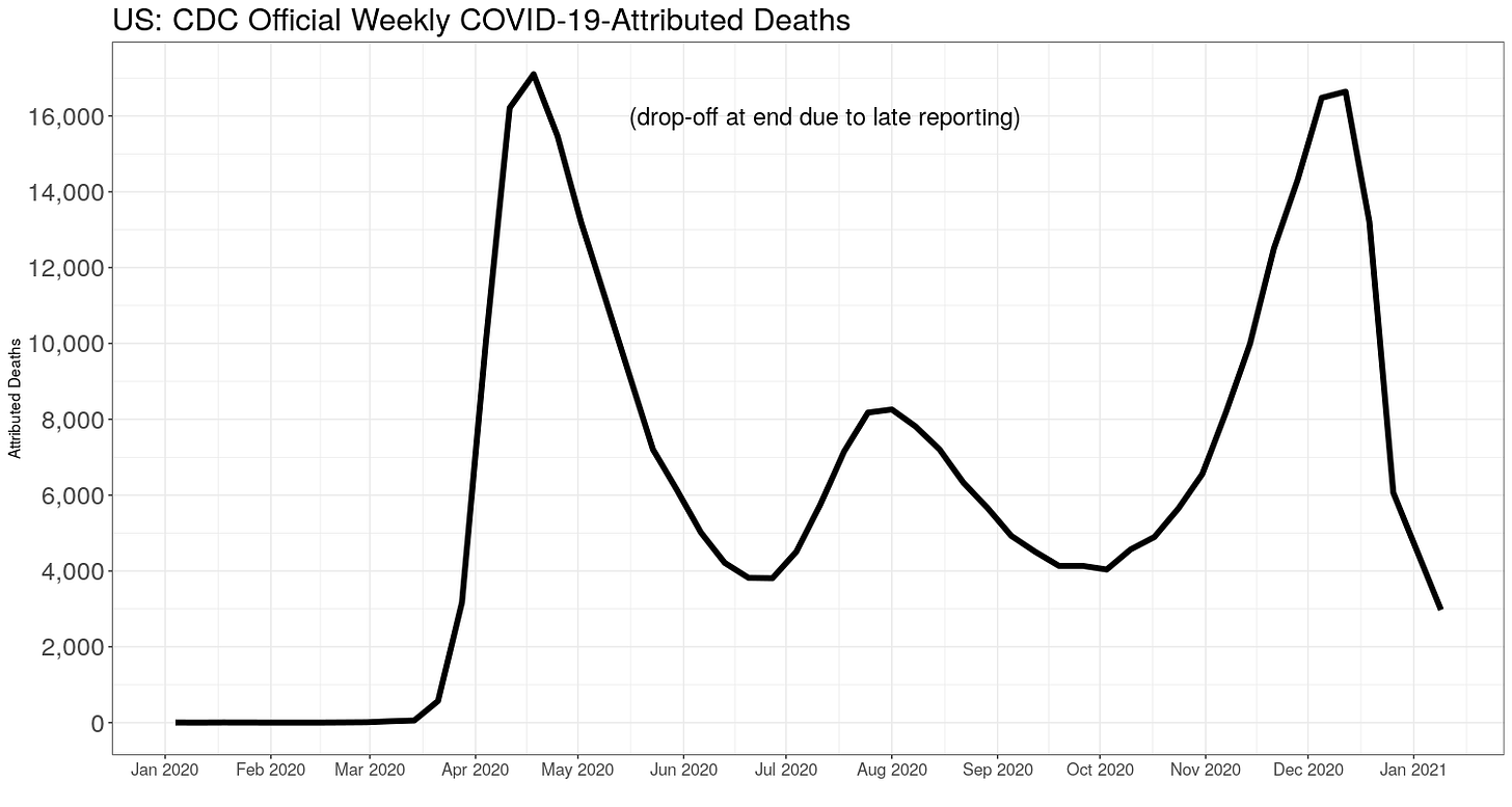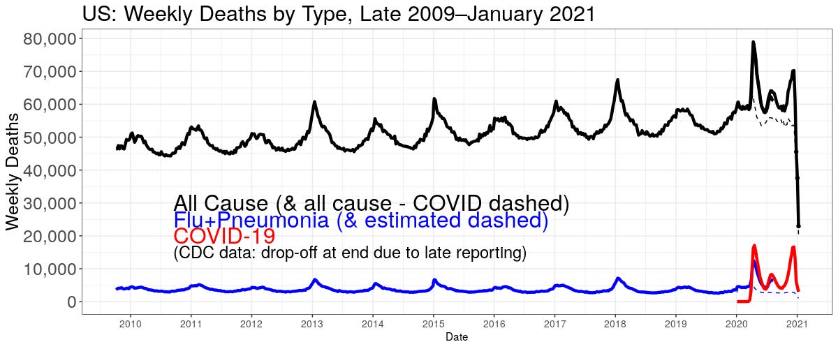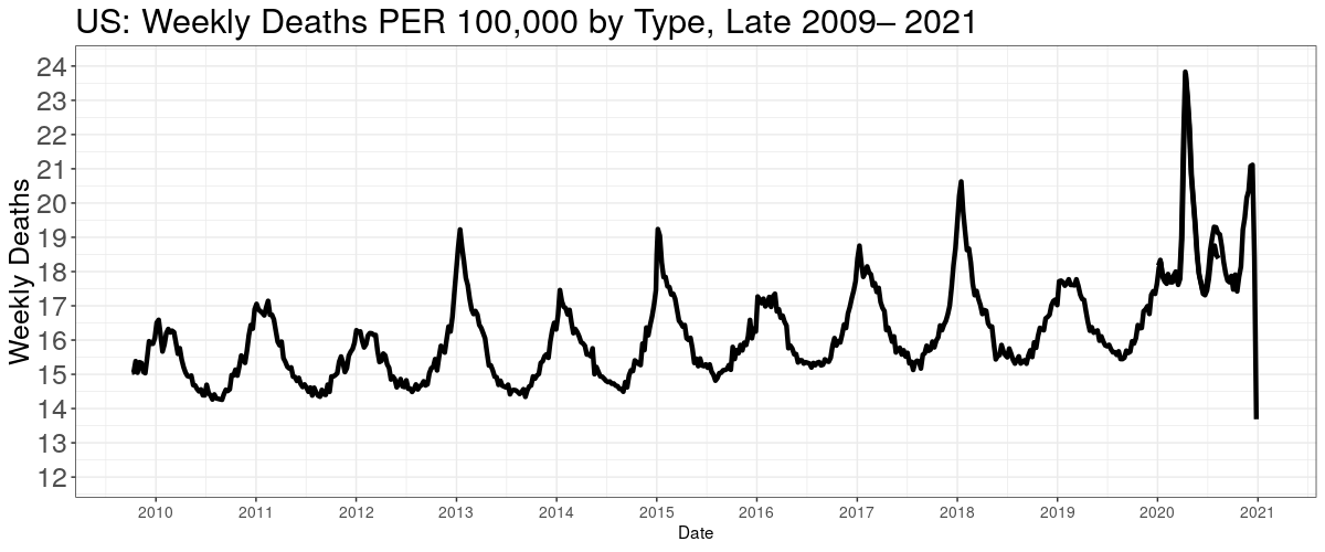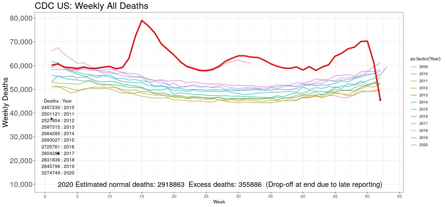 CDC weekly ALL CAUSE death counts, or the Perspective Plot, from late 2009 until now. The late drop off is late counting: it takes up to eight weeks to get all data, but most are in by three. We need to look at all cause deaths because we can't quite trust the attributed COVID numbers.