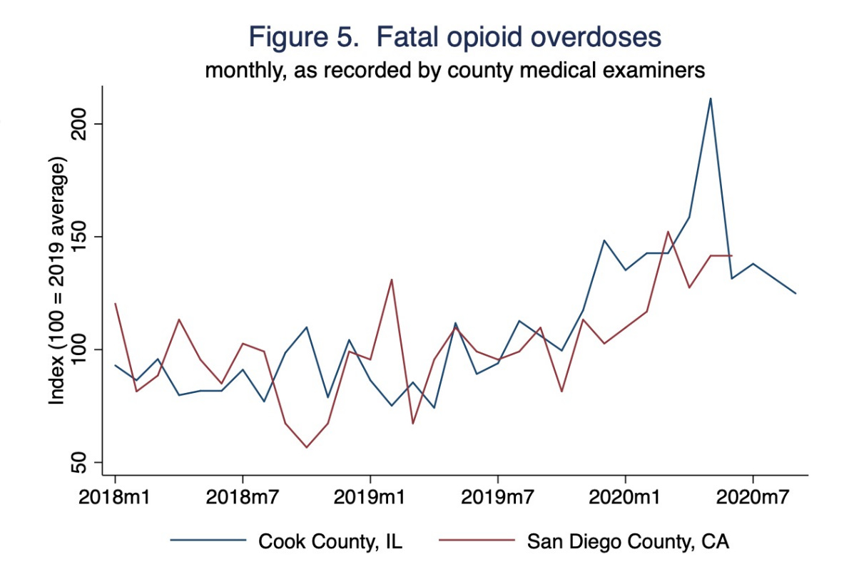 Just one picture, but you can look at the others in the paper. This is Opiod overdoes for two large metro areas. They're up.