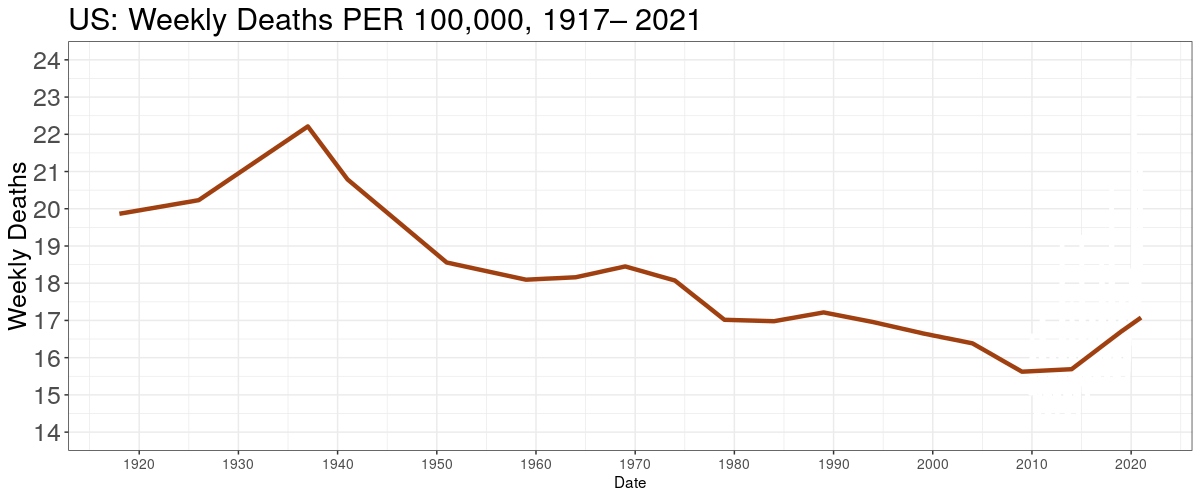 2020 brought us to about 1980 levels; and it was worse before then. Don't misunderstand this graph. First, it's averaged over the whole year, so individual weeks can't be seen. Second, in 2020 and 2021 it's mainly much older people who are dying, whereas in 1980 and before the age of deaths was much more spread out. Meaning, as claimed, it was worse then, assuming younger deaths are less good.
