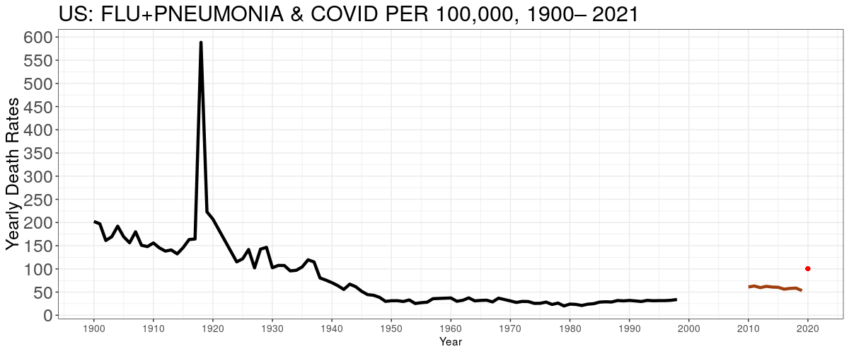 There is always concern when mixing sources that differences in definitions exist. The CDC data, at least, is self-consistent. The years 1999-2009 are missing. The brown are CDC data. The red dot is COVID. These are annual death rates.