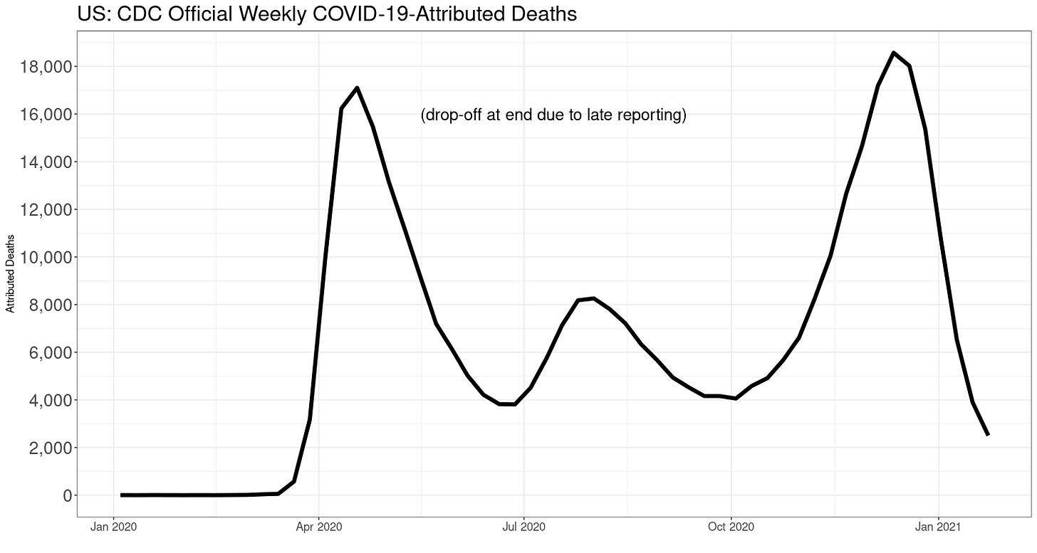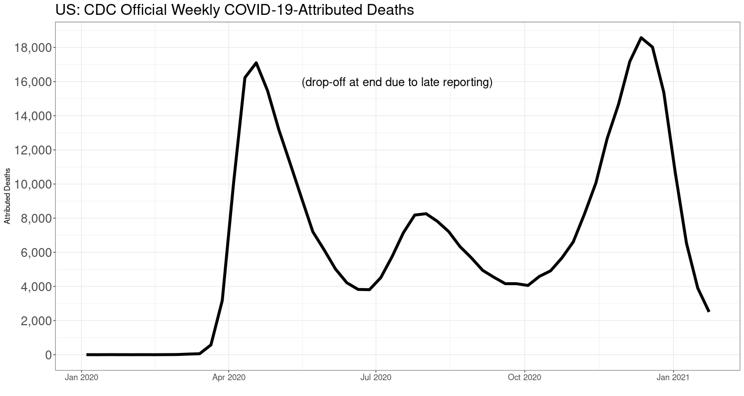 Even with late counting it's clear attributed deaths are on their way down---as we have been predicting. There is also concern some of these attributed deaths are flu or pneumonia and not COVID per se.