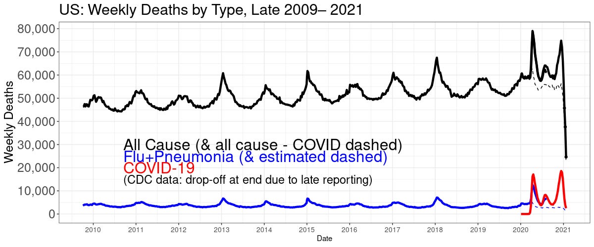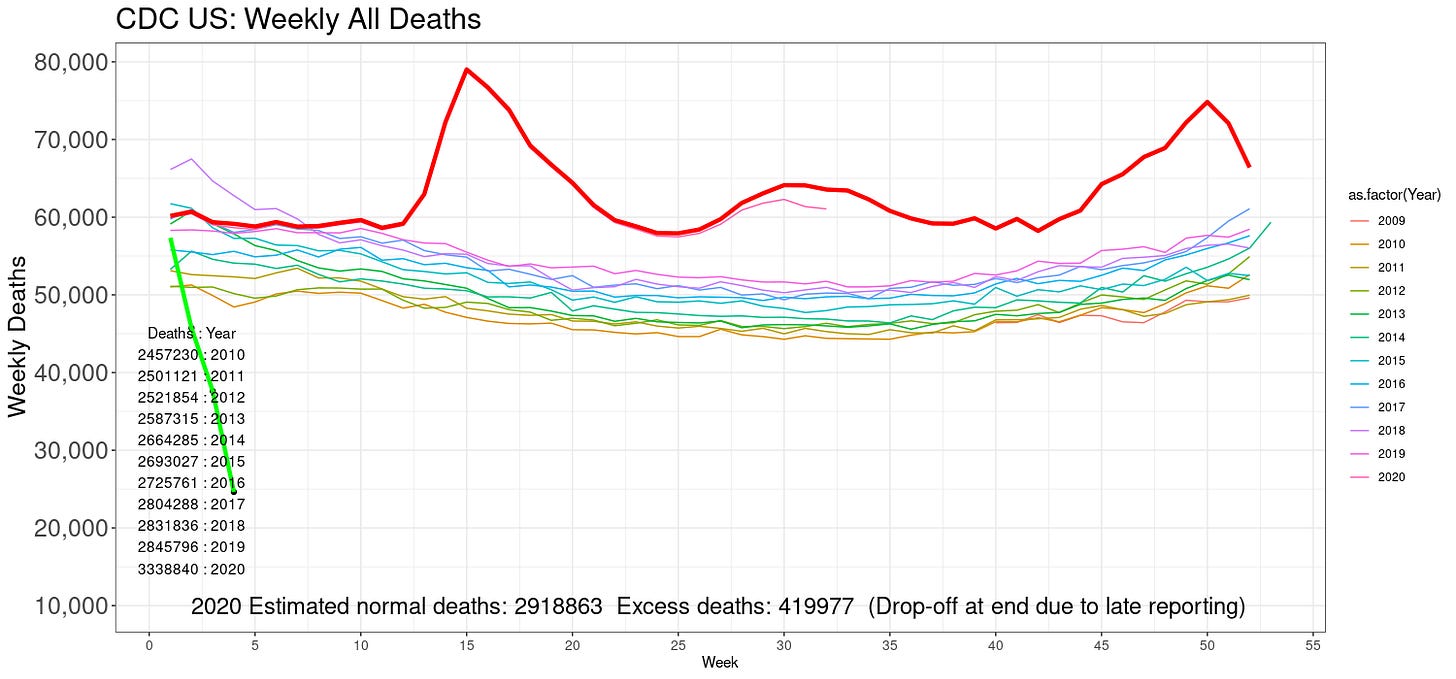 CDC weekly ALL CAUSE death counts, or the Perspective Plot, from late 2009 until now. The late drop off is late counting: it takes up to eight weeks to get all data. We need to look at all cause deaths because we can't quite trust the attributed COVID numbers.