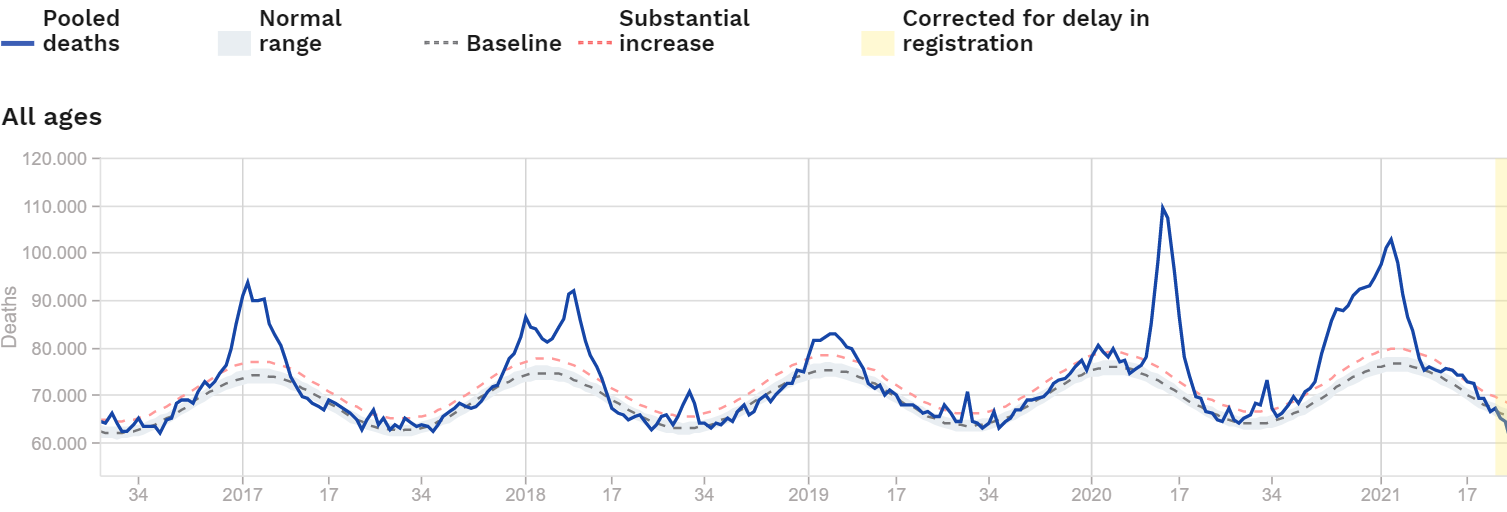 I've been following the excess death graph on https://www.euromomo.eu/ since early on in the plague of doom. It only just struck me however that the "Pooled Deaths" line is almost always above the "Baseline" and "Normal Range" i.e. the number of deaths is pretty much always "above average" and "excess deaths" almost never takes a negative value.