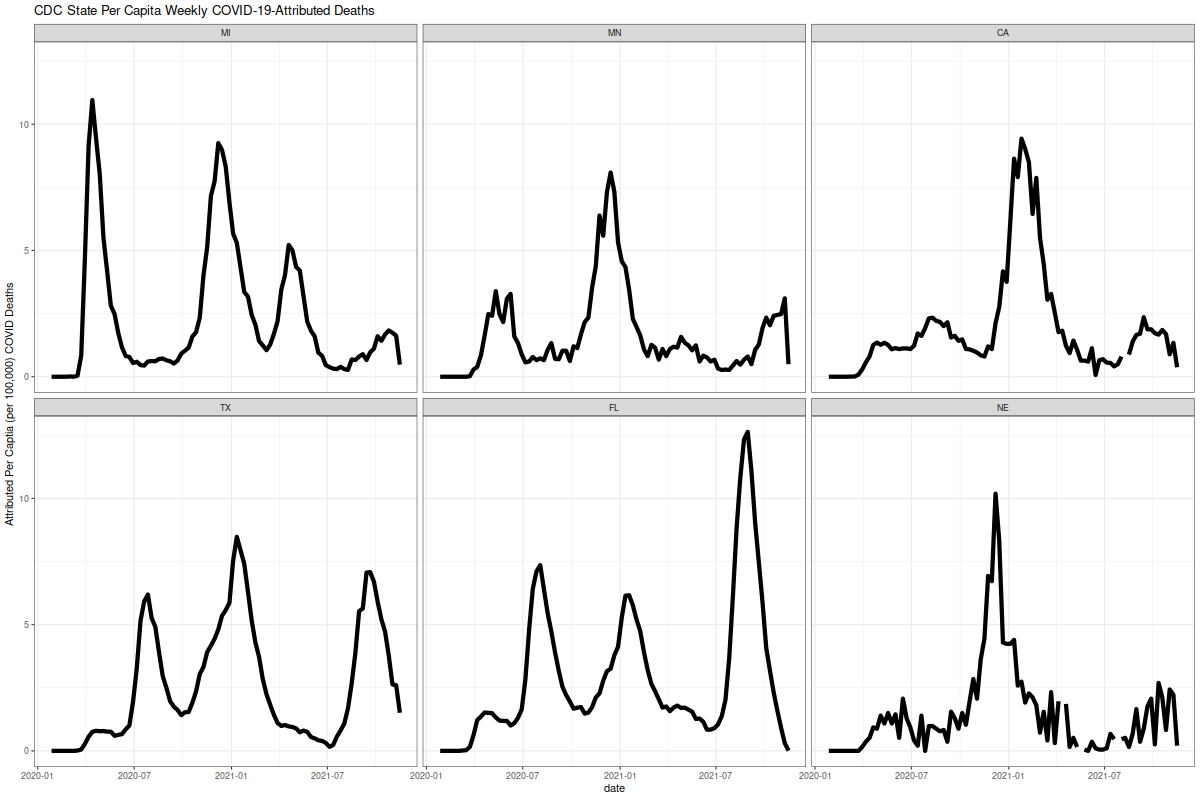 Not much to see, yes? Yes. All is as expected. Now let's gander at the coronadoom attributed deaths. If these were large in any age group, we'd see a bump in that group in all cause deaths, yes? We don't, so we don't expect doom deaths to be large. Let's see.