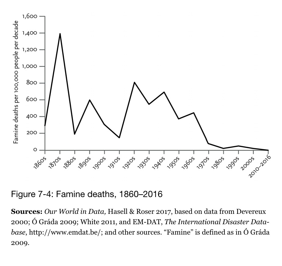 Agriculture is a great gift that is saving the world. Farm productivity exploded over the past 50 years. Worldwide famine deaths have crashed. The following chart is from Steven Pinker’s phenomenal Enlightenment Now (2018):