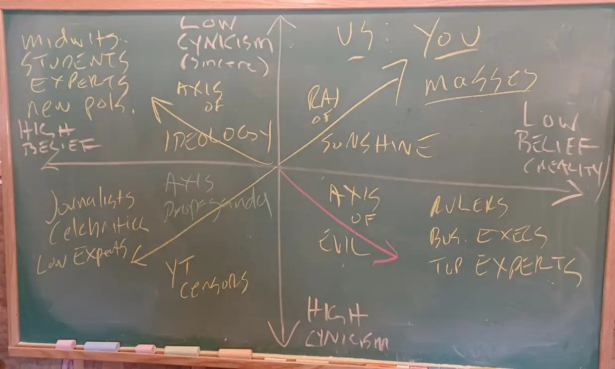 The people in this quadrant are low level Experts, newer politicians, midwit professors, and the young, especially college students. They ardently and sincerely believe that we only have one year left to “Save the planet”, and they have been saying that every year for the past thirty-some years. These are people who announce their pronouns at the start of meetings. Negative or contradictory evidence does not phase or influence them, evidence which is anyway seen as obviously false because it contradicts with their beliefs.