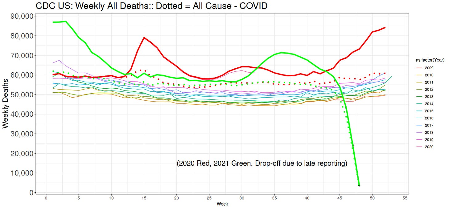 Keep the predilection for over-attributing Covid deaths in mind. Then look to weeks 30-40 or so. Anything past that is subject to late counting (takes about 8 weeks to get bulk of data in; last three weeks have black dots). Both the red and green dotted lines are higher than we'd expect absent Covid. What is causing these extra (beyond what we'd expect) deaths? It almost certainly isn't Covid, given undercounts are not at all likely. Has to be something else, then.