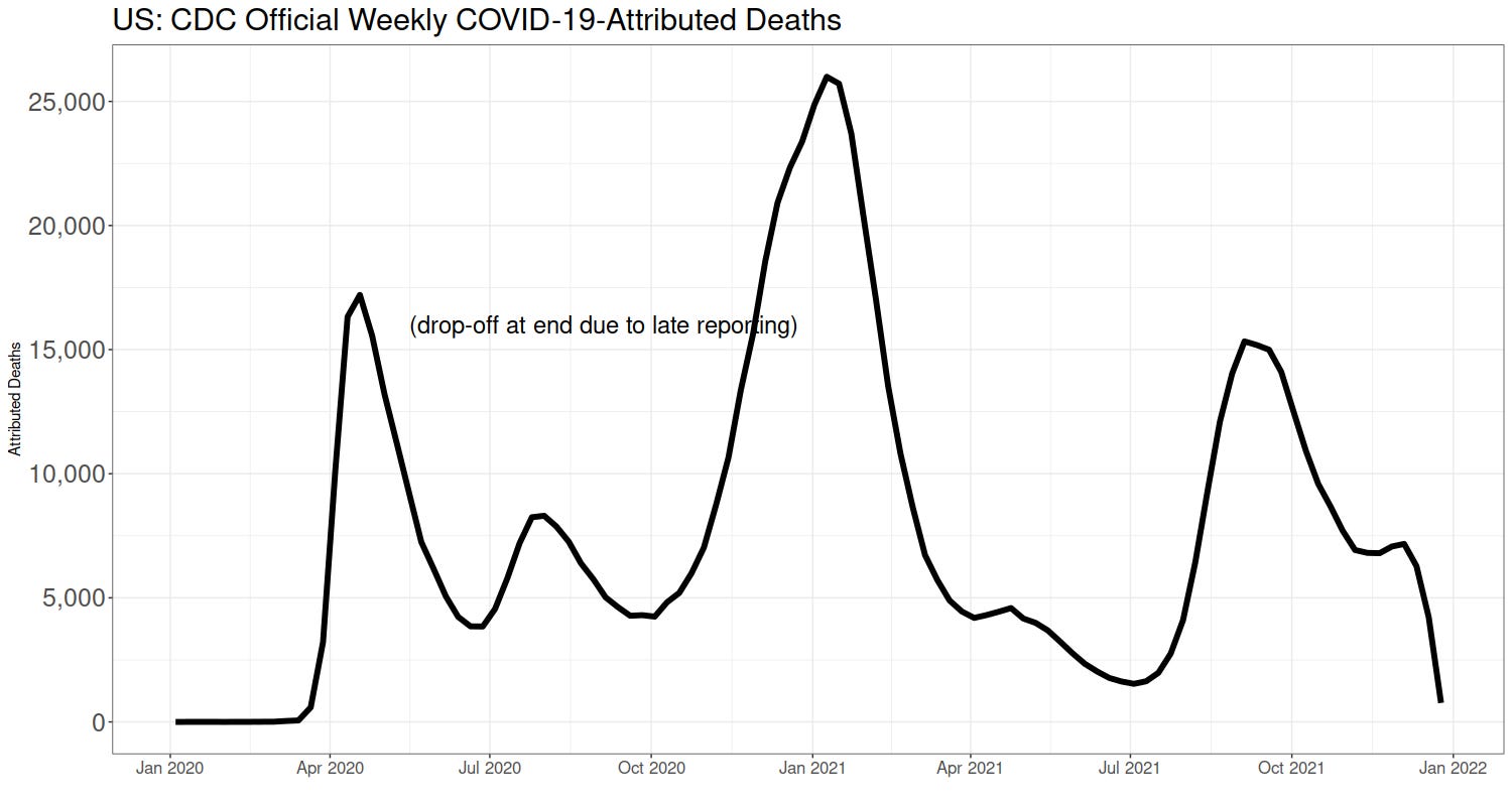 This is a slow week, so I'll only show one number, the CDC's weekly attributed coronadoom deaths.