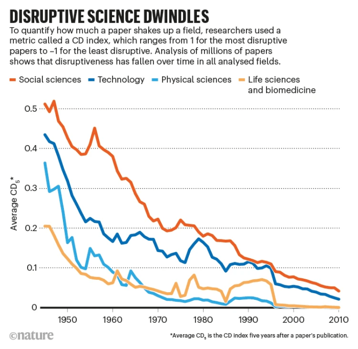Production of papers is higher than ever, of course, but what is worth reading is lower, and heading south. You’d miss a minor gem or two, but if you went by the rule Read No New Paper, your life would be a lot more pleasant. There are few to no new ideas, which makes it all the more depressing the dreary ones foisted on us are all called by their authors “novel”. Proven by the subtitle of the Nature piece: “Researchers are arguing over whether ‘disruptive’ or ‘novel’ science is waning – and how to remedy the problem.”
