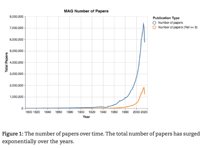 There are any number of quibbles with this arbitrary quantification. But it is a nice cartoon that captures the essence of our situation. Missing from the graph are the numbers of papers, which has grown by orders of magnitude since 1950. Here’s one estimate of the number of papers published by year, with, the authors said, a flaw in the database they used at the end. But you get the idea: