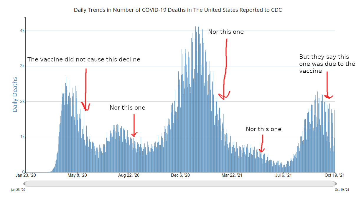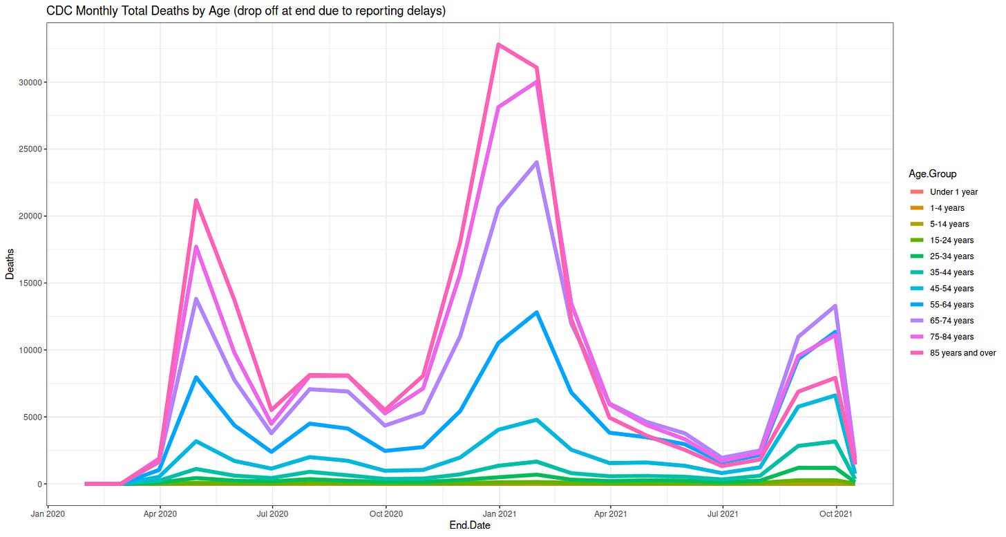 Vaccines were introduced (in large numbers) in the early spring of 2021, and the oldest got them first. Deaths from the doom, in a relative sense, began to drop, until the Dreaded Delta came along. It was easier to spread, but less deadly, in part because of its intrinsic characteristics, or in part because of vaccines.