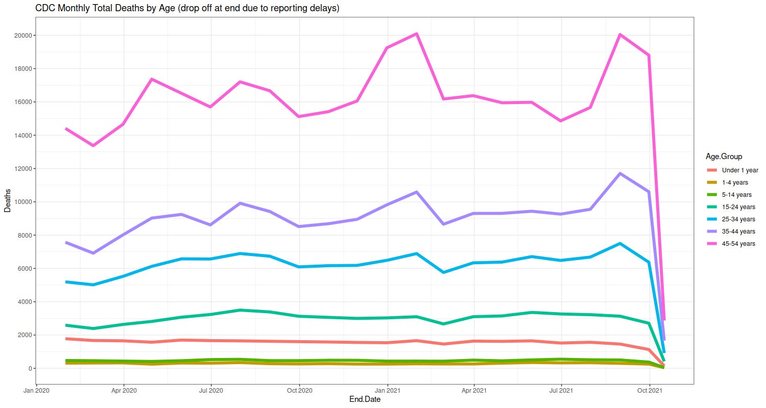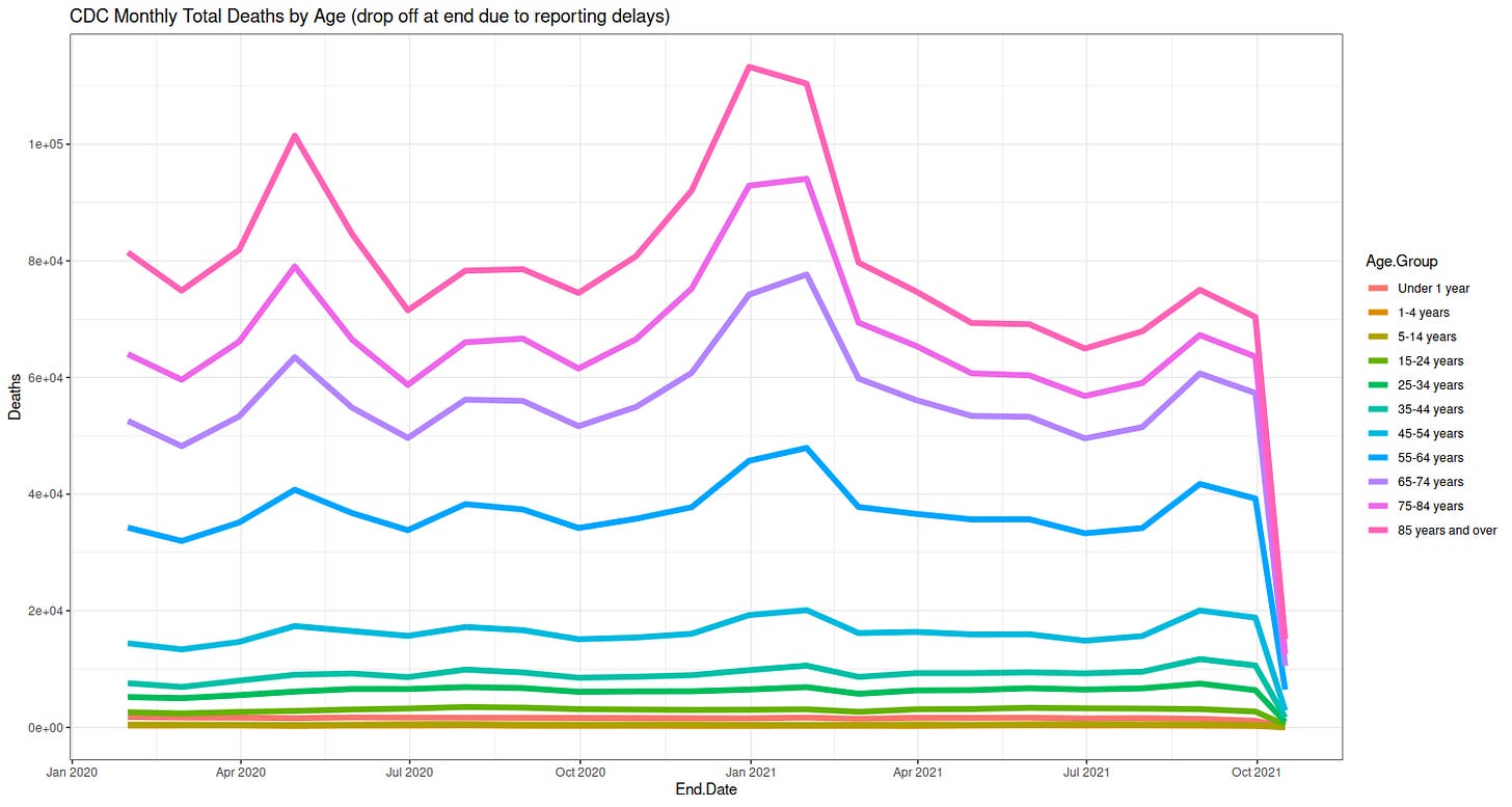 With those caveats, here are the monthly all-cause deaths by age group since January 2020 (the CDC doesn't publish these as one source before that date: source):