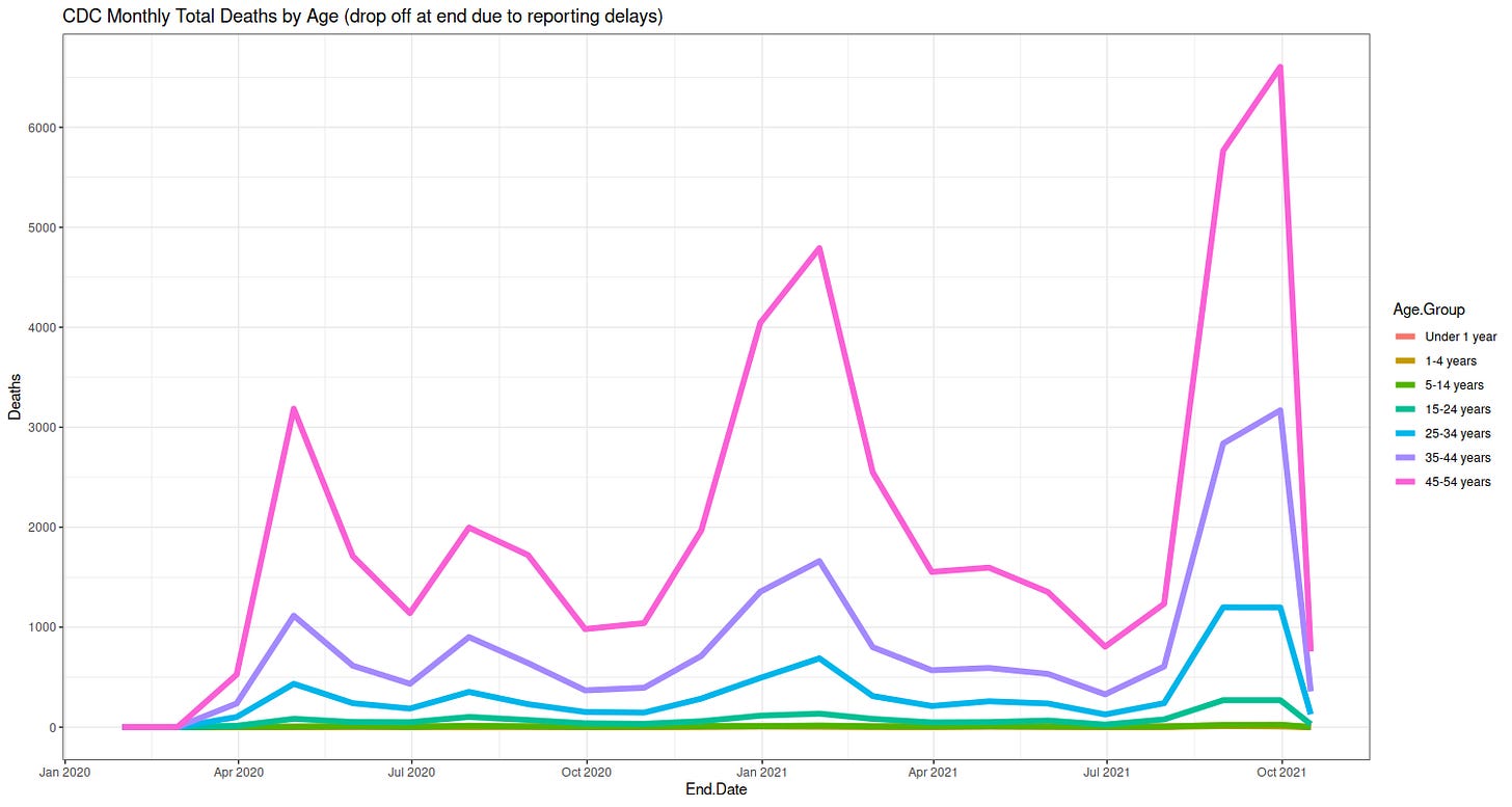 The youngest, without vaccination, are dying the least (or scarcely at all).