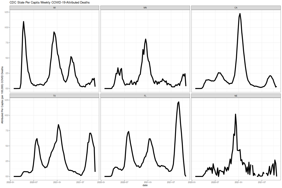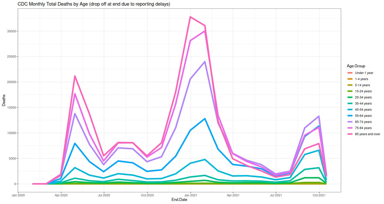 Focus on 85 years or older only, the group with the largest deaths. We see what we take to be the first coronadoom wave in April-May 2020, the second wave (in the southern/western USA) in summer 2020, the 2021 winter peak, and the Dreaded Delta blip in summer 2021. We don't yet assign causes with any certainty.