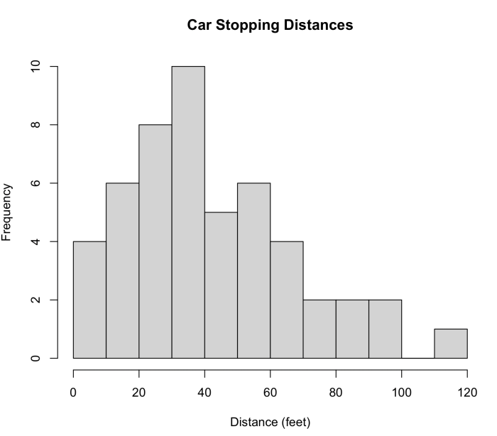 We have before us a collection of 50 stopping distances of cars. They were, we deduce, going before they could be stopping. Yes? Here is a histogram of those distances, in the civilized units of feet.