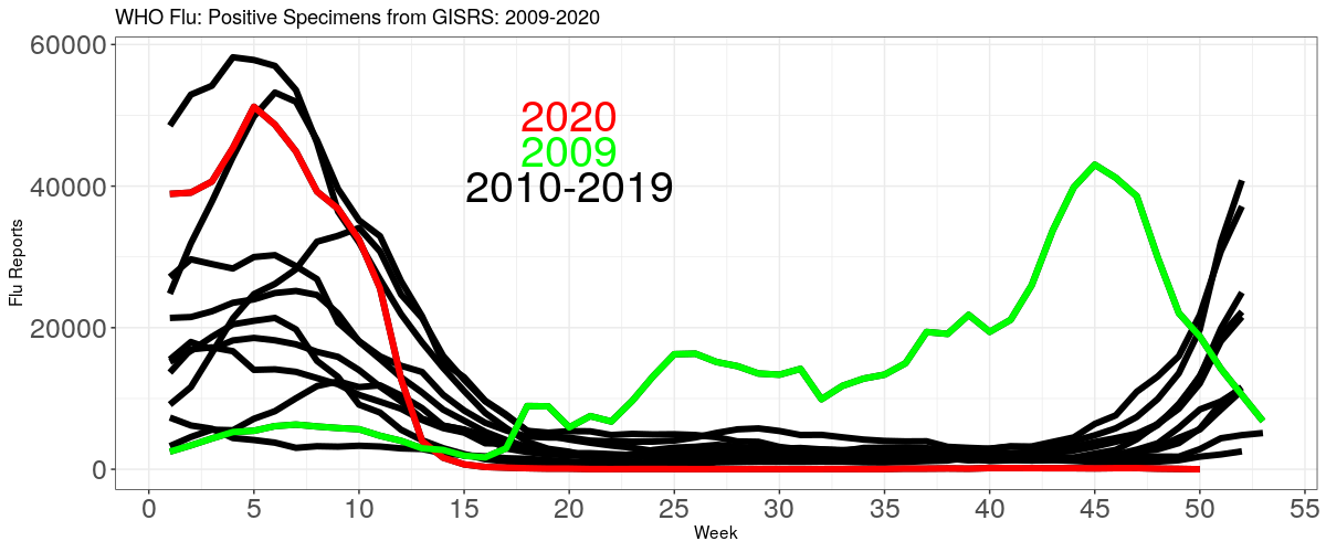 Flu has gone missing. Flu + pneumonia kill about 200,000 each and every year in the US. Not anymore. That is, we don't know any more, because nobody is bothering to check. Flu and pneumonia deaths have either vanished, or are being mistaken for COVID. The CDC classifies these deaths all in one group.