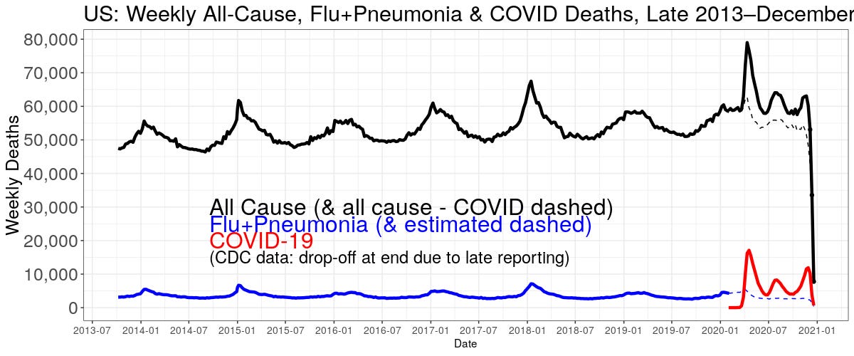 The CDC (important!) stopped reporting separate flu and pneumonia deaths midway through 2020, but I estimate them after by subtracting deaths "involving" COVID from those "involving" (their word) pneumonia or flu or COVID. That's the dashed blue line.
