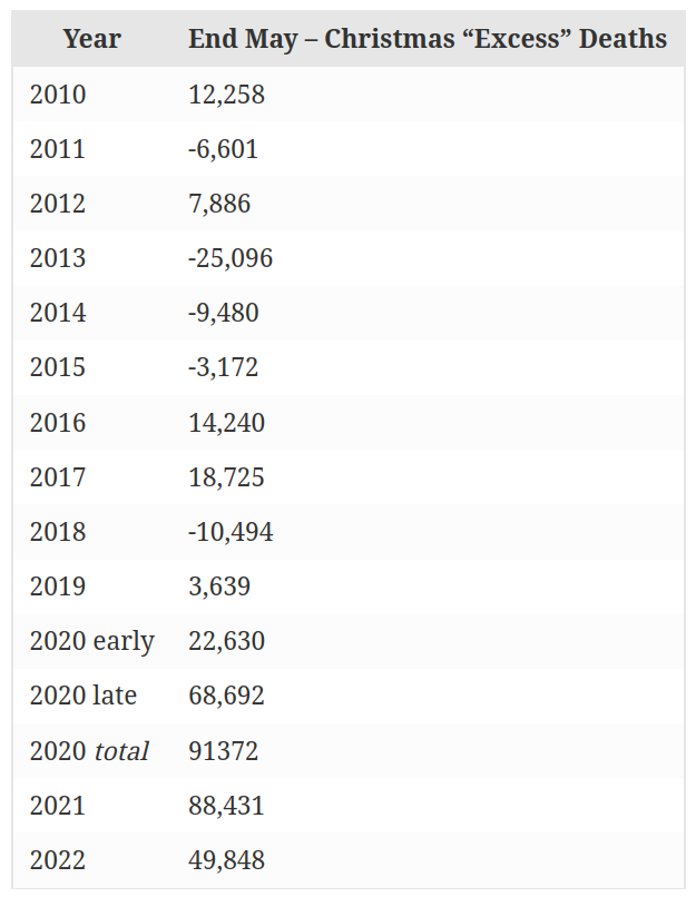 Here, then, is a chart of the “excess” deaths from the last week of May through about Christmas, from 2010 to 2022: