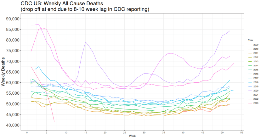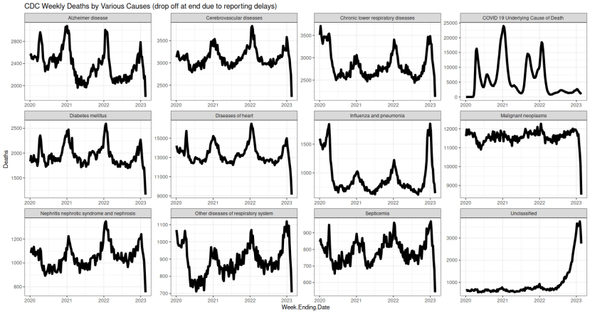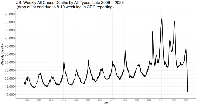 This took a long time to get to, because we were waiting, patiently, for the CDC to count deaths. They are always eight to sixteen weeks behind. This is of particular concern to the last batch of data presented below. This means we can be confident the data won’t change much for all dates up to about the beginning of 2023.