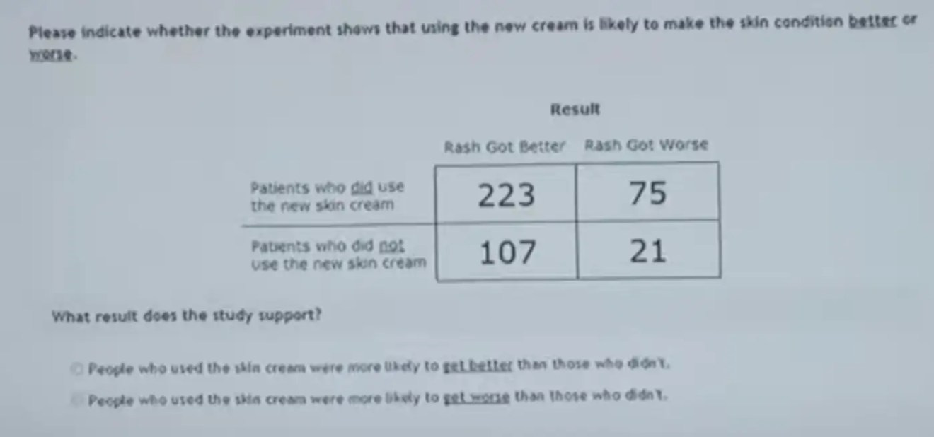 Regular readers will have figured out the correct answer. It won’t be any surprise to learn, as Kahan says, that the more numerate (on some crude scale he had) people were, the more likely they were to get this. Same if he reversed the column labels. Meaning whether or not people got it right, it had nothing to do with skin cream working or failing per se.