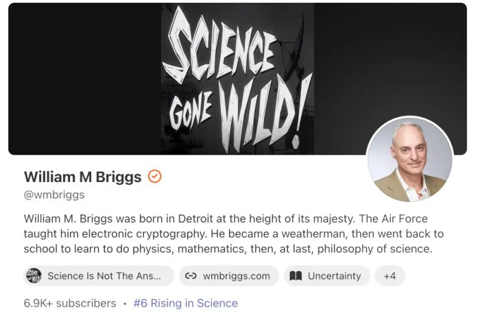 The worst tool, and one whose use is always and every instance a fallacy, is the so-called hypothesis test. We have done (“wee Ps”) in Class so many times, we’re sick of it (or I am). But I want to prove to you “tests” are fallacious another way, using one familiar example and one common situation. And with no math!