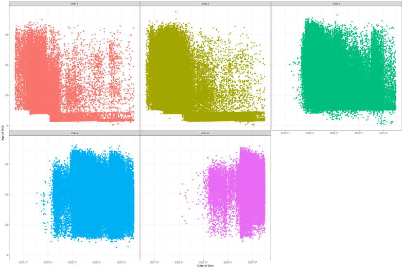 But, perhaps, they could have just died from the bug, too, being sickly or weak. We might be able to see that in these next two (final) plots. The first is the age at shot by shot date, for those who received just 1 shot, just 2, etc.