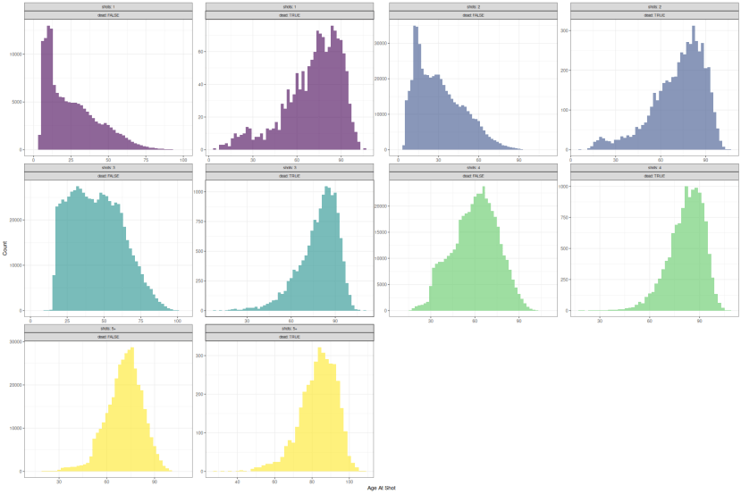 In the hopes of clearing up some of that, we have the distributions of age at shot, which shows the ages at which people got the shots, for each number of shots, split by those who lived and those who later died.