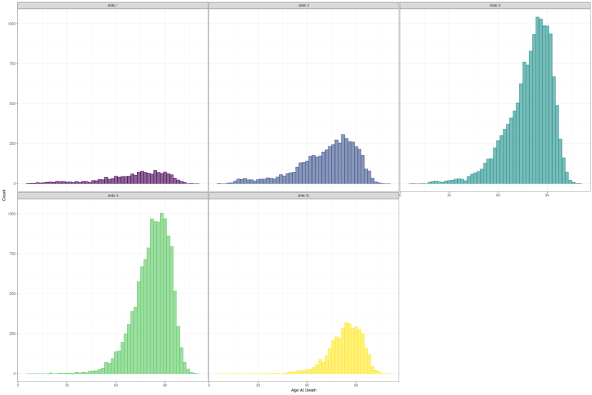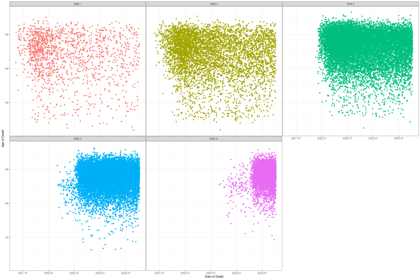 There’s a small increase in younger deaths, especially for those with only 1 or 2 shots, and maybe 3. We are comparing the shape of the distributions, here, across those with different numbers of shots, and are not comparing absolute counts. All other things equal, if the shots had nothing to do with age at death, the shapes would be the same. But, of course, all things are not equal, like the timing of reported official covid deaths. And the timing of “advertisements” and official “requests” to get boosted, etc.