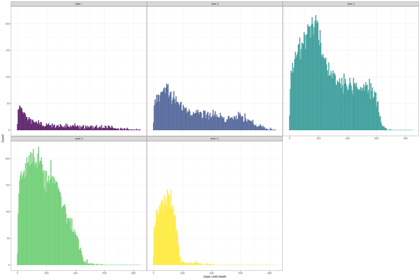 Next is distribution of days until death after a person’s last shot, which is just that: the number of days until death for those with just 1 shot, just 2, and so on. The shots=3 sticks up the most because 3 shots was the most. Followed by 2, then 4, then 5+, then 1, the smallest group.