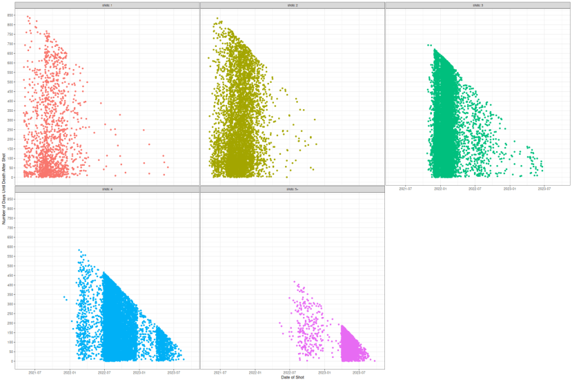 The data, which has over 4 million records representing 2,215,725 individuals, consisted of a medical record number, vax batch ID, dose number (from 1 up to an absurd 32), vax date, death date (if any), vax name, date of birth. From these I calculated whether a person was dead or alive during the period of the data, the number of days after being vaxxed until death (if any). Because the number of shots was somewhat suspect in a handful of cases (like that 32), I grouped them into 1, 2, 3, 4, 5+ shots. (See the above top for a caveat on the data.)