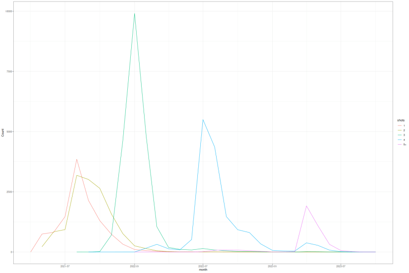 The red line is the count of deaths by month for those who had one shot and died, at any point, from (to us) unknown causes, and (for the moment) independent of age. And so on for the other shot numbers.
