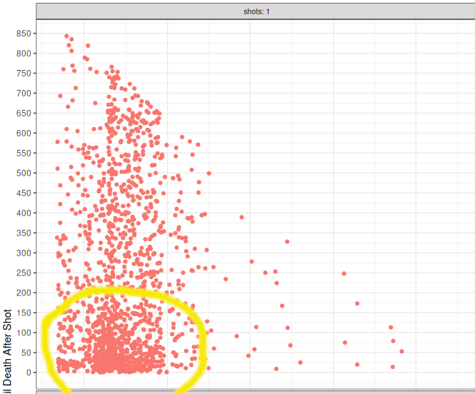That means two things: (1) the triangle shape is explained because the maximum number of days until death can never exceed the number of days left in the dataset from the shot day, and (2) we should certainly see what we see above, a bump in low numbers of days followed by a tailing off, because people got the shot at various days throughout the time period, which means where must be lower number of days until death.