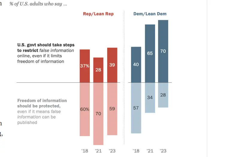 Support for both technology companies and the government taking steps to restrict false information online has grown in recent years. For example, the share of U.S. adults who say the federal government should restrict false information has risen from 39% in 2018 to 55% in 2023.