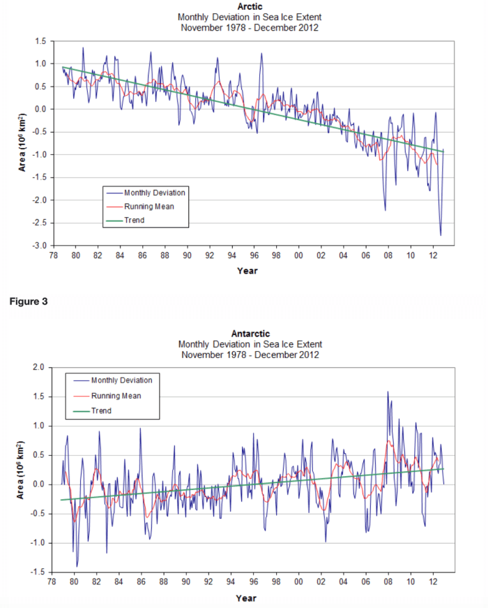 Let’s first prove that (modifying an old article on wrote on this). We begin with two time series of ice extent at either end of the world, as claimed by NASA: