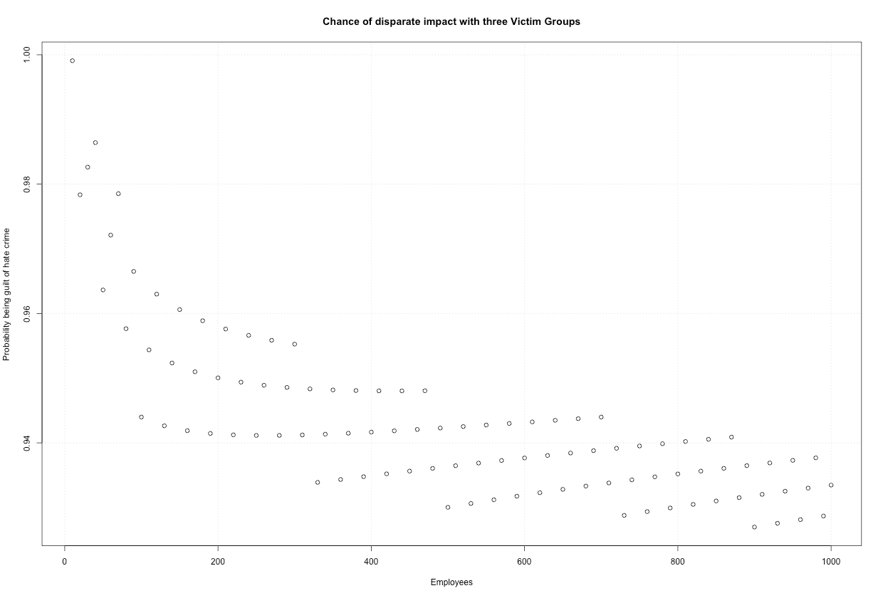 We also have to be more careful about the number of employees. The fewer you hire, the more likely you can be charged with a hate crime. But once you hire about 1,000 or more, the chance settles down to about 93%.