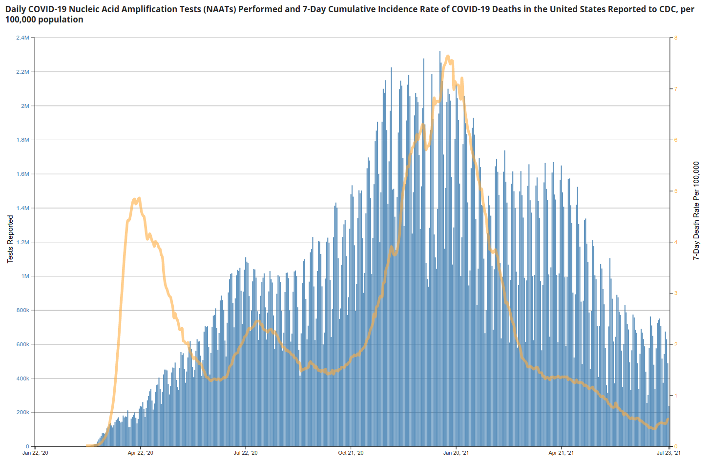 Here is the daily testing (in blue; left y-axis) and 7-day attributed deaths per 100,000 (in yellow; right y-axis). Source. I wish these were weekly or even daily deaths because of the built in lag in running means, but let's work with it.