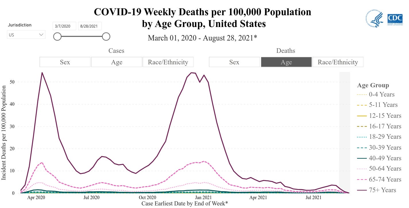 I'm sending you a plot of Covid deaths by age, prepared by the CDC. You'll see (and anybody can see, even nervous parents) this is an old person's disease. You have to strain to see when any kids died. The rate is so low they just don't show up. The rate is decidedly not increasing, even as the deaths do bump up a bit for the elderly because of the Delta.