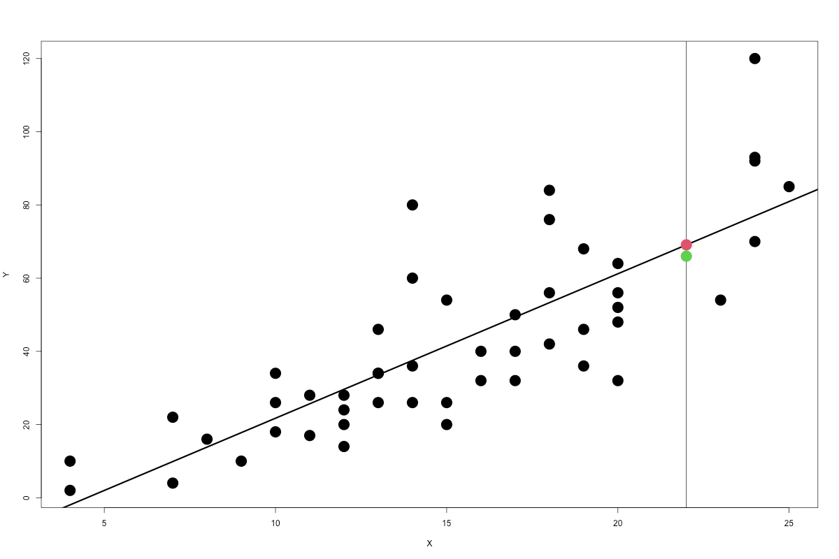 The X can be, as scientists thrill to say, “novel”, i.e. an X never before seen. Yet we can still produce a Y for it, as the picture shows. The vertical line is an X never before seen by the model. Its prediction is in red on the line (of course), and the Y real life gave us is in green.
